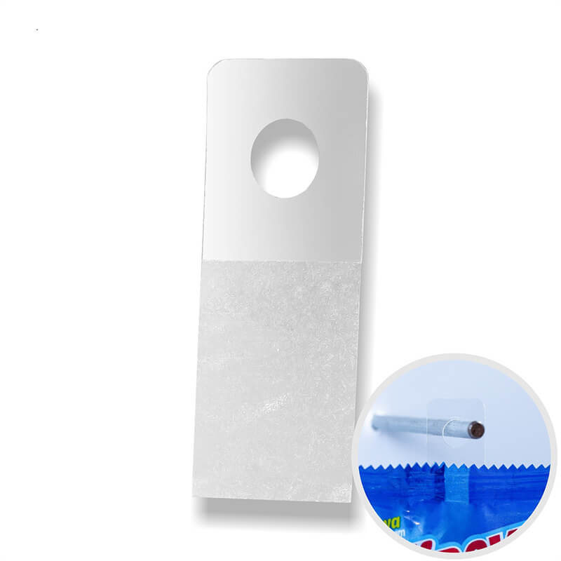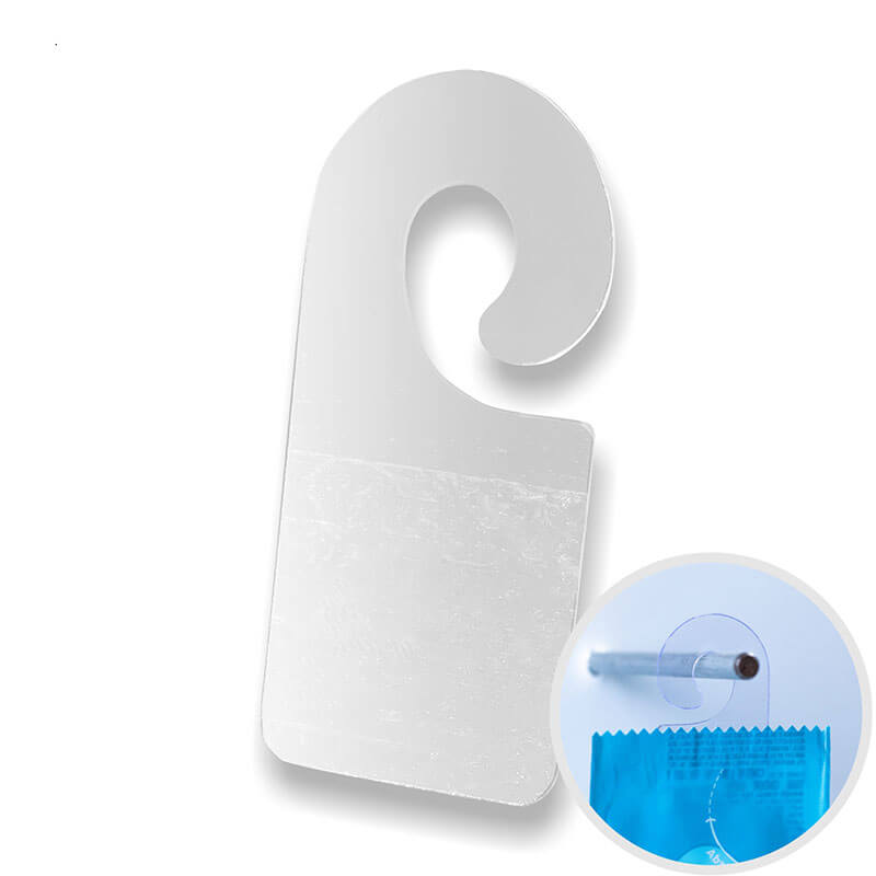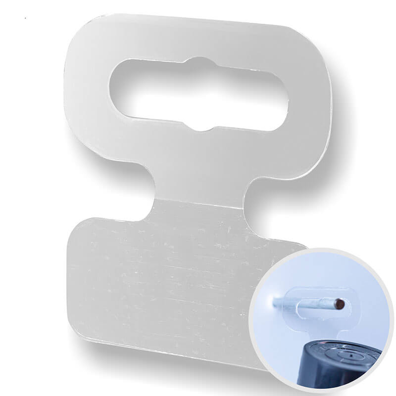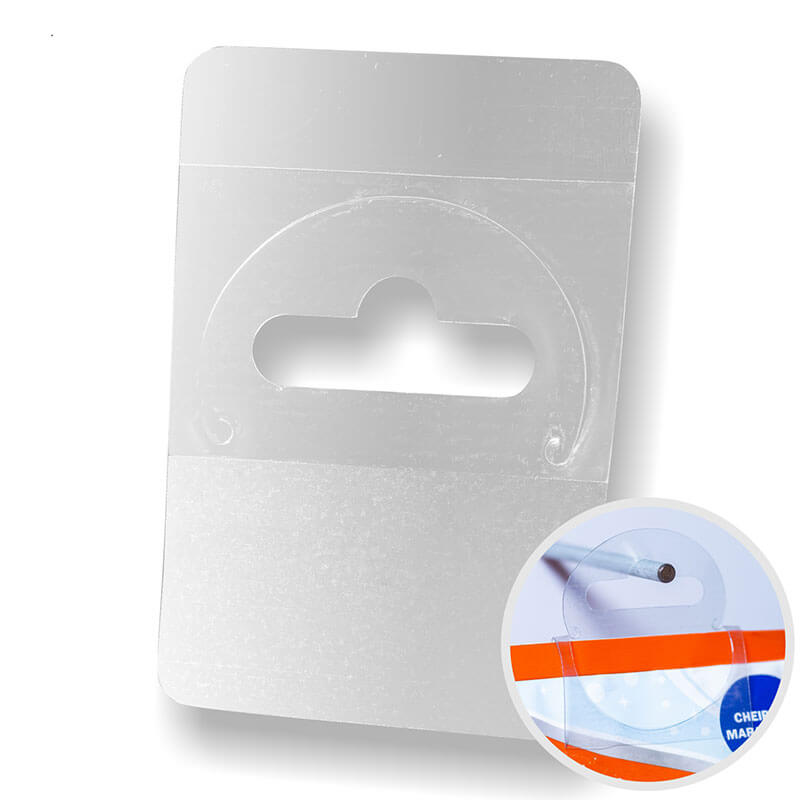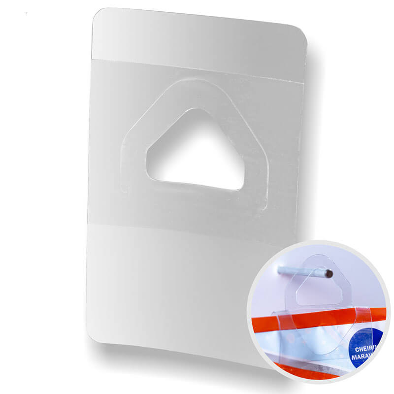O Hang Tab é uma etiqueta plástica adesiva com furo na parte superior. Possui uma camada adesiva de alta performance utilizada para colar nas superfícies das embalagens.
